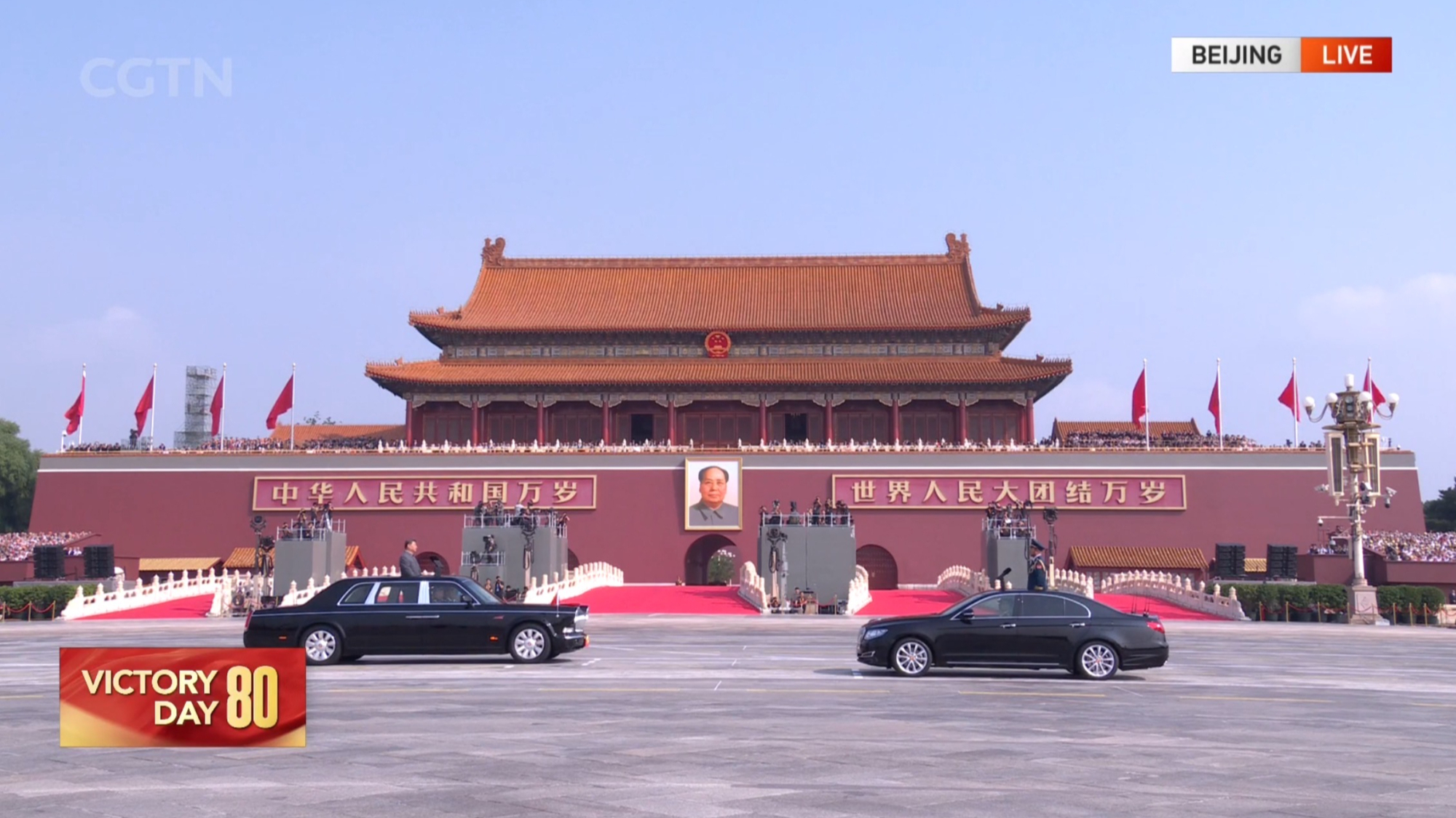 شی جن پھنگ کا جاپانی جارحیت کے خلاف چینی عوام کی مزاحمتی جنگ اور عالمی فاشسٹ مخالف جنگ کی فتح کی 80 ویں سالگرہ کے موقع پر فوجی پریڈ کا معائنہ