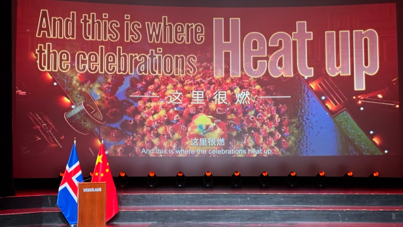 آئس لینڈ میں اسپرنگ فیسٹیول کے حوالے سے منعقدہ چینی سفارت خانے کے استقبالیہ میں سی ایم جی اسپرنگ فیسٹیول گالا کی پروموشنل ویڈیو کی نمائش